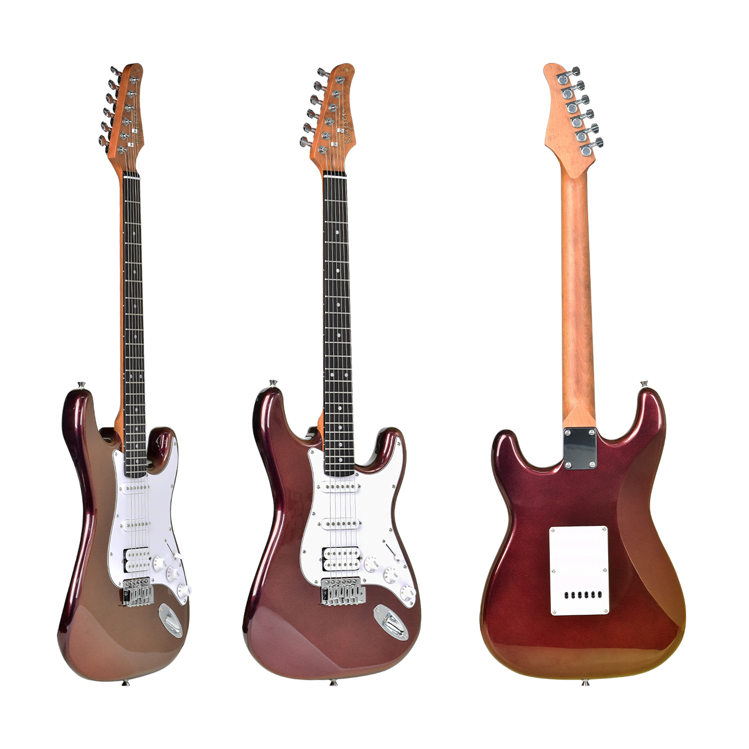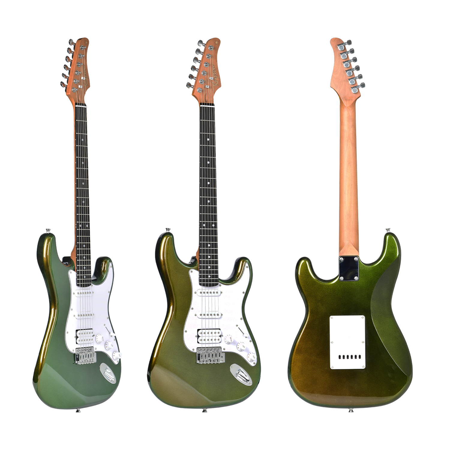 La guitarra eléctrica Kaysen Chameleon es perfecta para principiantes y también adecuada para guitarristas profesionales. El cuerpo está hecho de madera de tilo. El color del cuerpo cambia en diferentes ángulos. 4 opciones de color: púrpura se vuelve azul, verde se vuelve dorado, rojo se vuelve dorado y azul se vuelve púrpura. El diapasón está hecho de palisandro y los trastes son de acero inoxidable con 22 trastes. El mástil de arce tostado carbonizado estilo C es cómodo para los músicos al tocar esta guitarra . La pastilla es SSH, con interruptores de 5 posiciones, así como 1 volumen y 2 tonos. El clavijero es de fundición a presión con diseño de refuerzo sin tornillos. Es fácil de afinar. El acabado es de alto brillo, lo que mejora el aspecto de toda la guitarra.